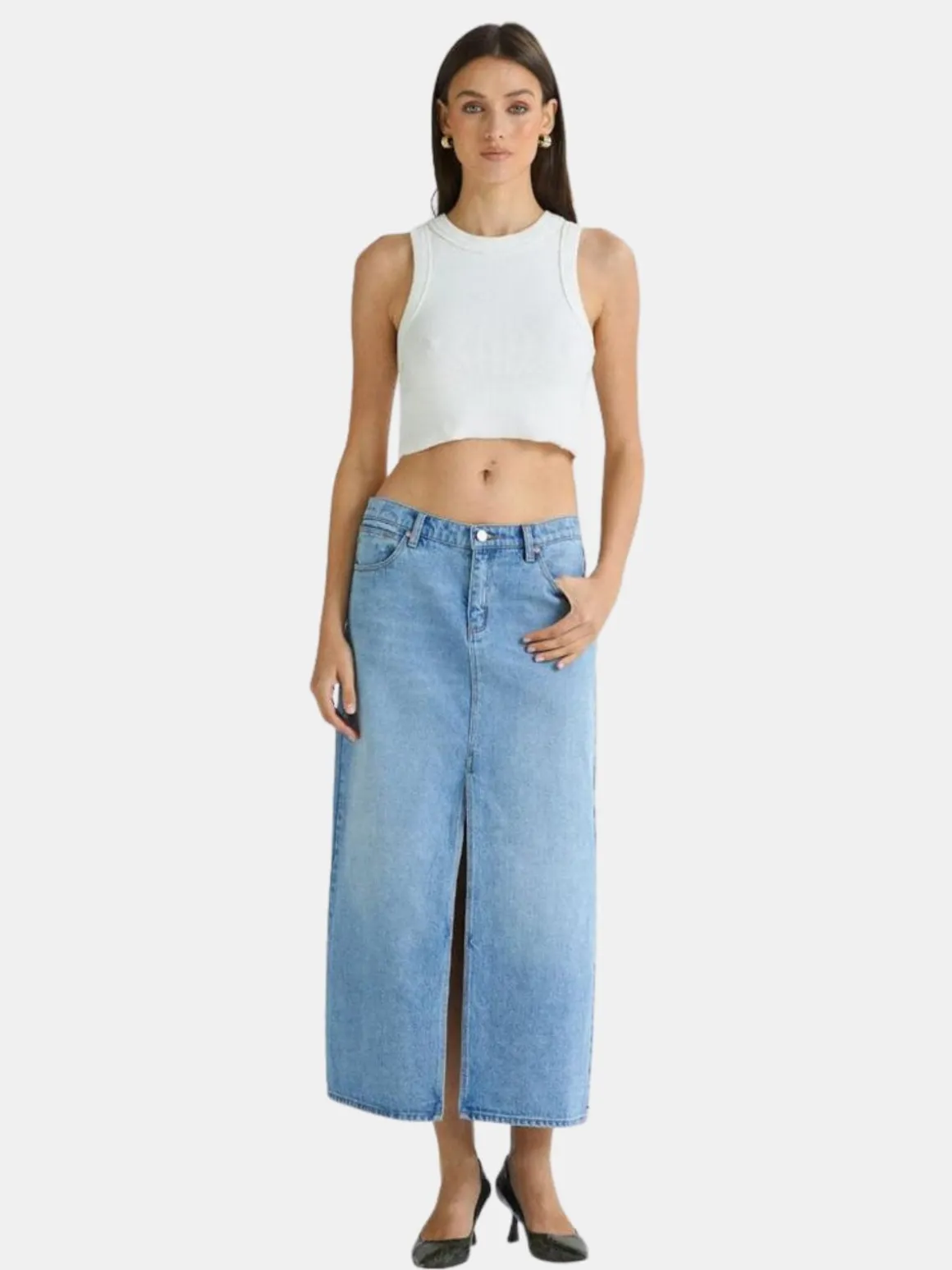 The 99 Low Maxi Skirt in Sylvie is a low rise maxi skirt designed with a front split in an easy light wash blue.