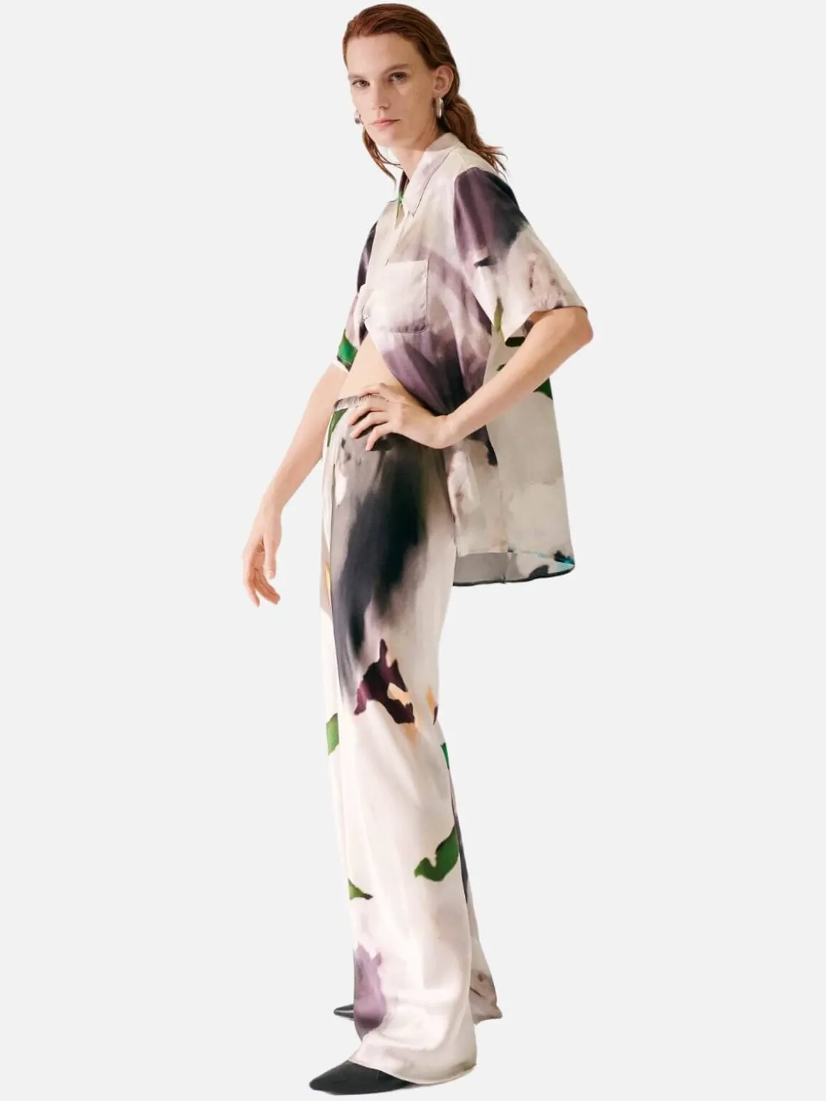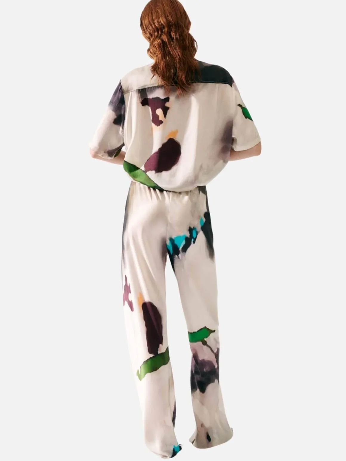 Cut from a soft sandwashed silk, the legs fall into a fluid silhouette that gathers at the ankle to form a slight bell-bottom. An elasticated waistband sits high above the hip, pulling in to highlight the waistline. The ultimate in comfort and style.